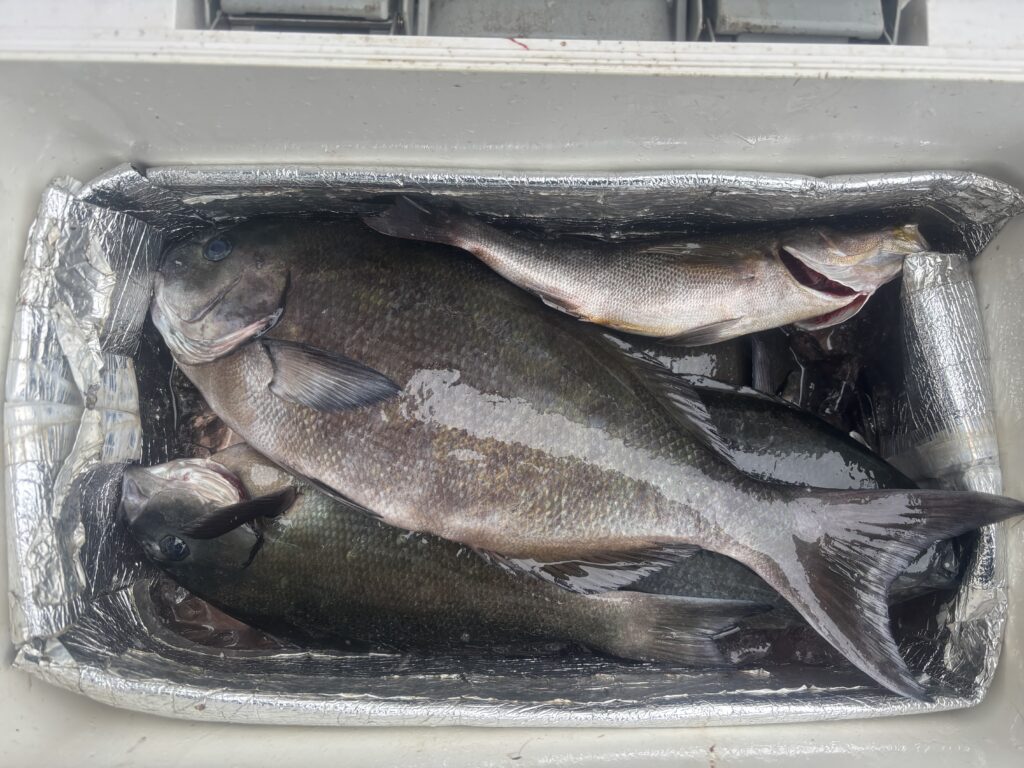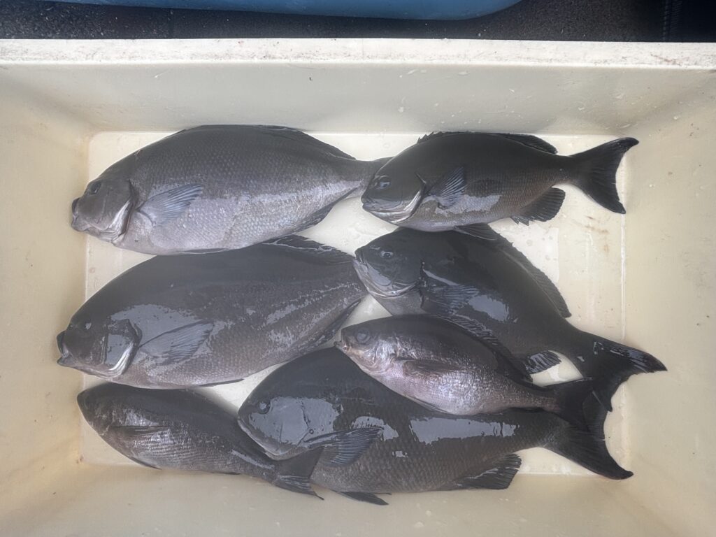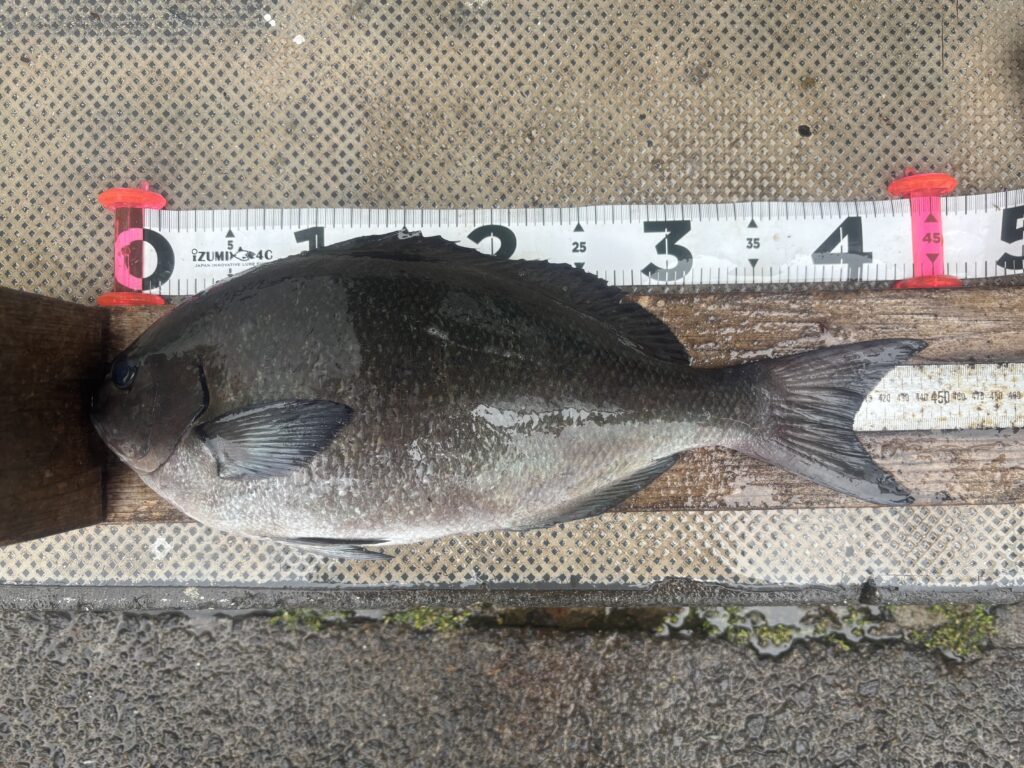 今日もほとんど潮が動かず朝の内だけ緩い下り潮が入った時にだけ尾長メジナが出ました、ハリスは3号で4mとり、浮きは00サイズでガン玉4号を潮受け下に付けるだけの軽い仕掛けで浮きが馴染んで少し張り気味にしていると尾長メジナが良く食いました、今日はサラシも無く苦戦しましたが誘いを入れる方が浅い棚で食います🎣誘いを入れなく深い棚まで落とすと付けエサは残りますのでそのまま流せばイサキがポツポツ釣れる状況でした、最長サイズの尾長メジナより大きいのを浮かせましたが残念ながらサメに持っていかれる事もありますのでまだま大型尾長メジナが釣れるチャンスはあります、今日はルアーマンは居ませんでしたがシモリ周りではマキエを捕食しているヒラスズキも確認しましたので荒れた日やサラシが出る日は良い思いが出来ると思います、底物は潮次第ではチャンスがありますが今日は全く潮動かずでヤドカリもそのまま残る状況でした🎣水温と潮次第では狙い目ですね