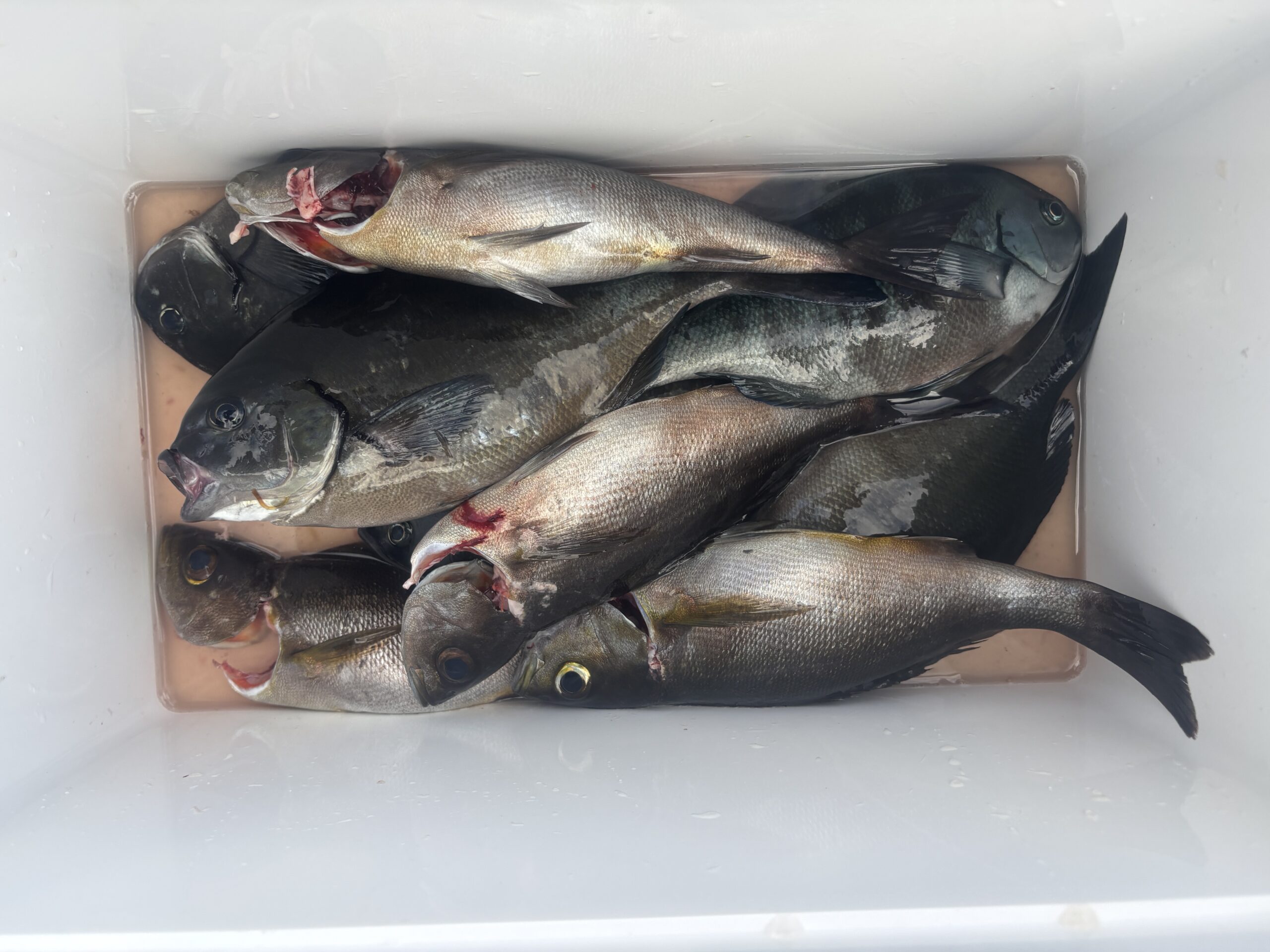 今日は朝方から下り潮が早く魚の活性は今一の状況でした、11時過ぎた頃に下り潮が緩くなりサラシの出ている所では活性が良く大型のヒラスズキも出ました🎣今日は潮も動いたので底物狙いの方にはベストな状況でした🎣フカセ釣りの方は場所によっては大型のイスズミによるエサ取りもあり中々思うような釣りが出来ない方も見受けられました