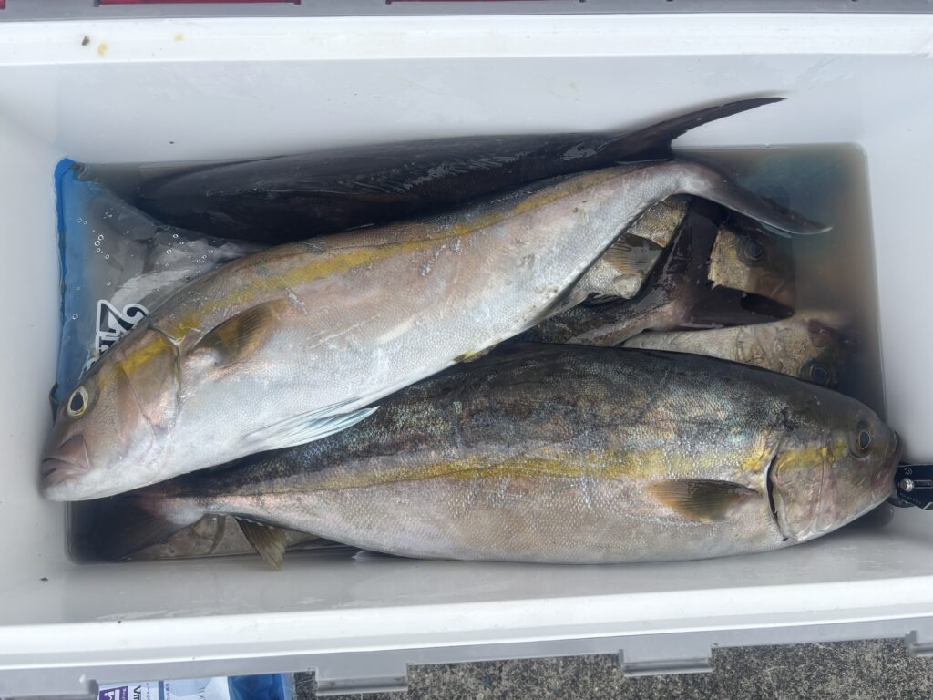 今日は久しぶりに出船したのですが、道中横根周辺までは17.5度と言う水温で神子元島に到着した時は23.2度で台風後水温が一気に下がりました、南っけのウネリが朝残り気味でしたが本場側も船が着けれる状況でした、潮向きは沖側から来るので上り潮とは若干違う方向となり水温低下も重なり朝から9時頃まではエサも取られない状況が続き苦戦しました、徐々に下り潮が効いてきたあたりから江ノ口周辺では青物のナブラが立ち始めると同時に魚の活性も上向きになり当たりも出始める感じで船の回収時刻まではトロトロの下り潮で沖側だけはきいている感じです、ルアーマンの釣果は全て本場側で適度にサラシもあったのと下り潮が効いてからはベイトを追いかける状況もありますので神子元産超美味なカンパチが数でました