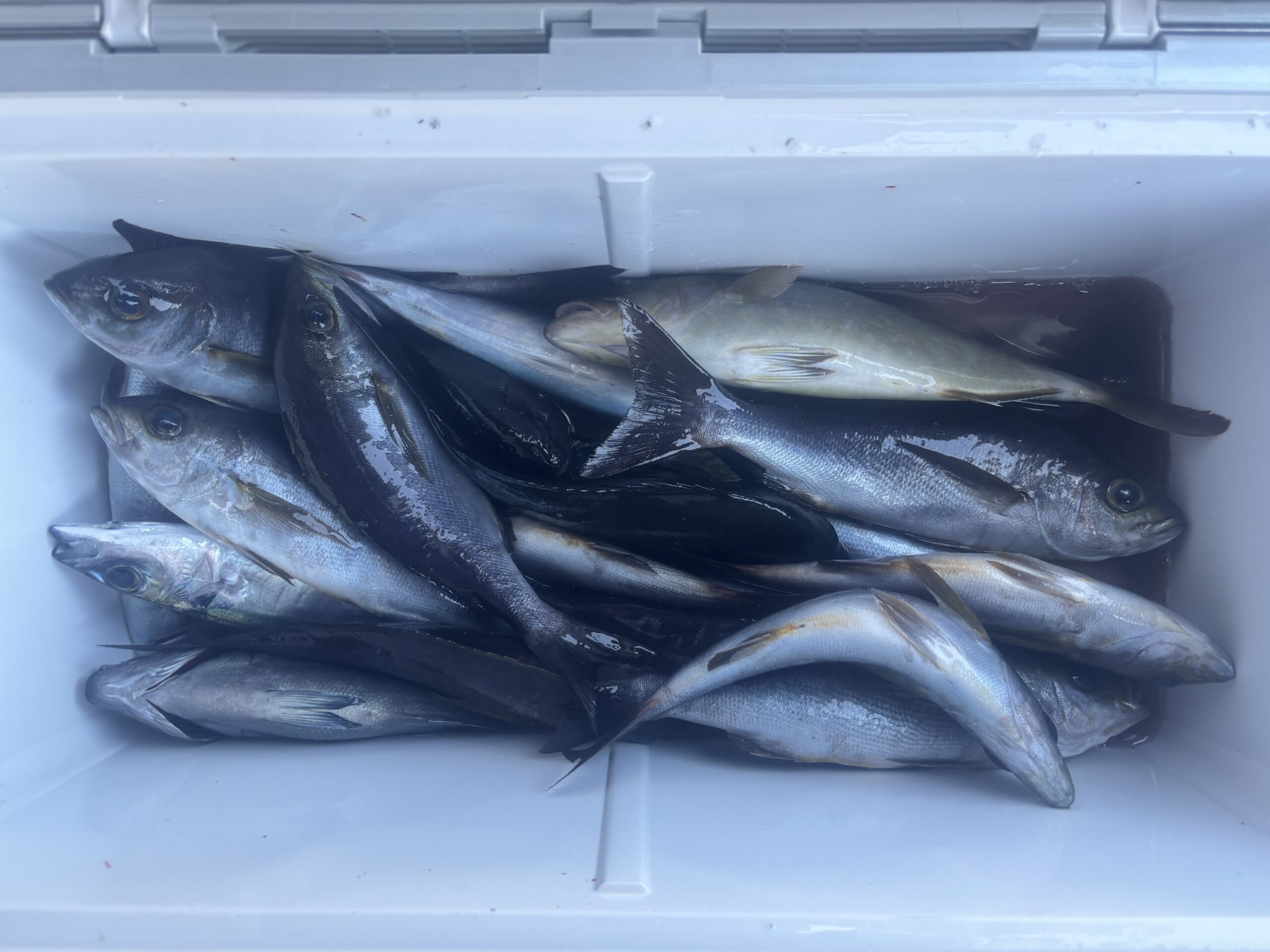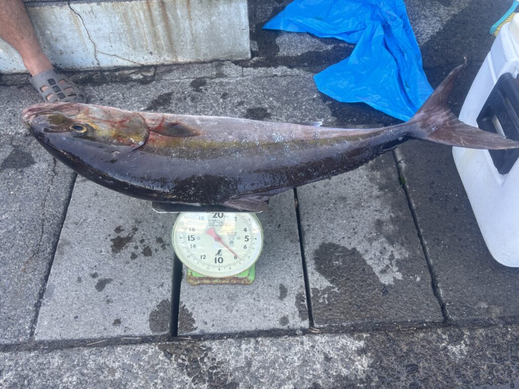 今日は朝の内は下り潮が入っているのですがカツオ側はトロトロの潮で、二つ根側は結構早い状況ですので場所によりムラがある状況でした、それでもカツオから二つ根まではベイト(サンマ)がぎっしりいる状況で活性は高い感じでした、久しぶりにデカバンカンパチの7.7k(90cm)を含む2キロから3キロくらいの当たりは朝から頻繁にある状況でバラシも多数、カツオ側でもあまり潮が動いてない状況の中カンパチやスマカツオを含む数匹があがりました、デカバンは8時に反応が出たみたいですがトップでもチェイスは数回あったみたいで本日の状況の中では流石のルアーマンだと思います、水温的には25.0度前後ですが潮次第では爆発するのではないかと思われます🎣