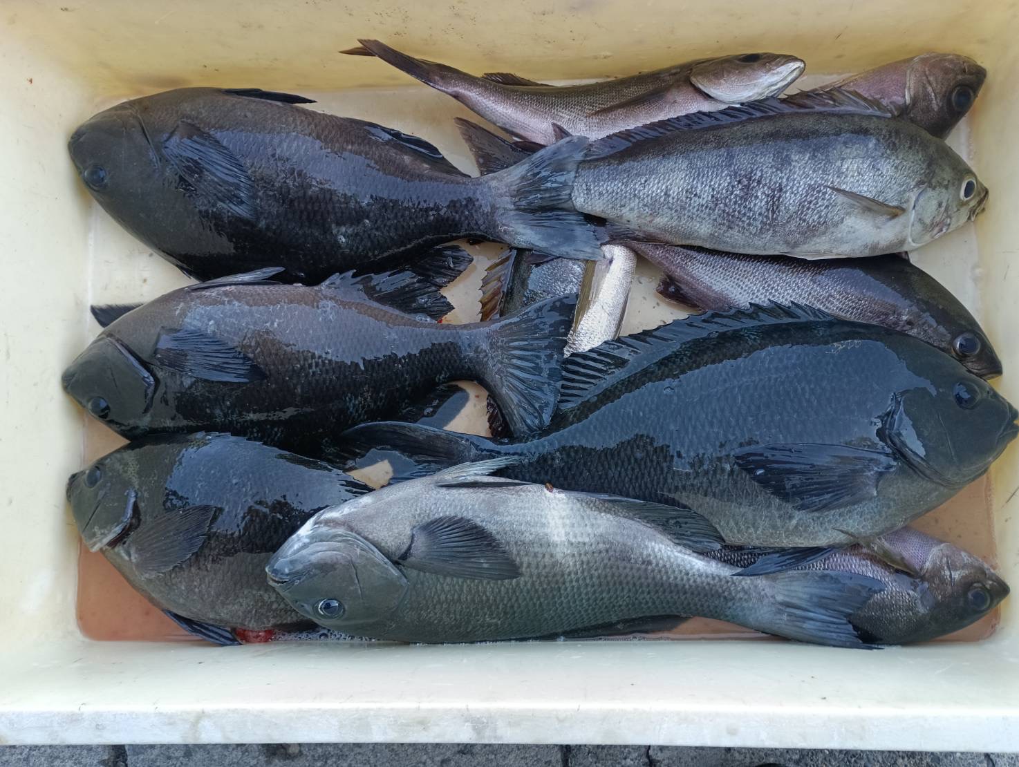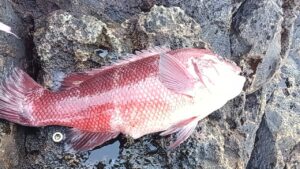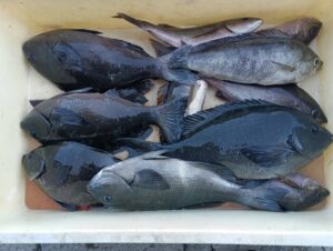 今日は朝の内上り潮ですが北東風が強い為本場側やアンドロの渡礁でした、上り潮は本場側ではさほど速くは感じなく2時間後には直ぐに止まる状態🎣その後下り潮になるのですが上り潮より感じずらくとっても緩い潮に変わります、それでも朝の内の潮で尾長メジナの42cmが本場で出るなど枚数の釣果が得られました、アンドロ側では朝は尾長メジナの39cmや外道ですがカンダイが顔を出し、その後もイサキがポツポツ釣れました🎣また潮向きが変わった時からは外向きでは口太メジナ42cmなど一時期は入れ食い状態になるなど楽しめたみたいです、釣れる棚は尾長メジナは2ヒロ前後でイサキは深棚で探る感じで、口太メジナも2ヒロ前後と魚が口を使う時は浅い状況ですね