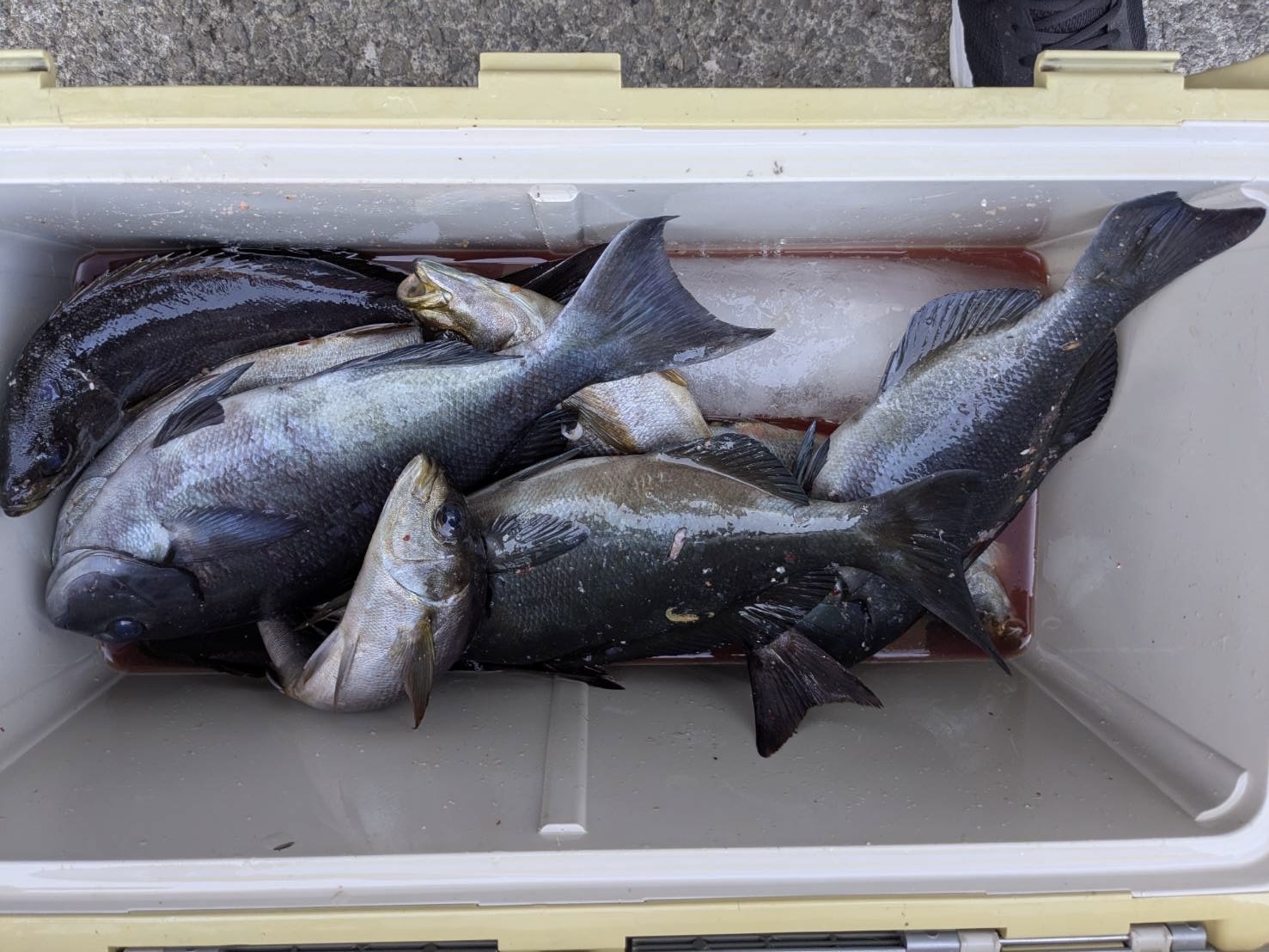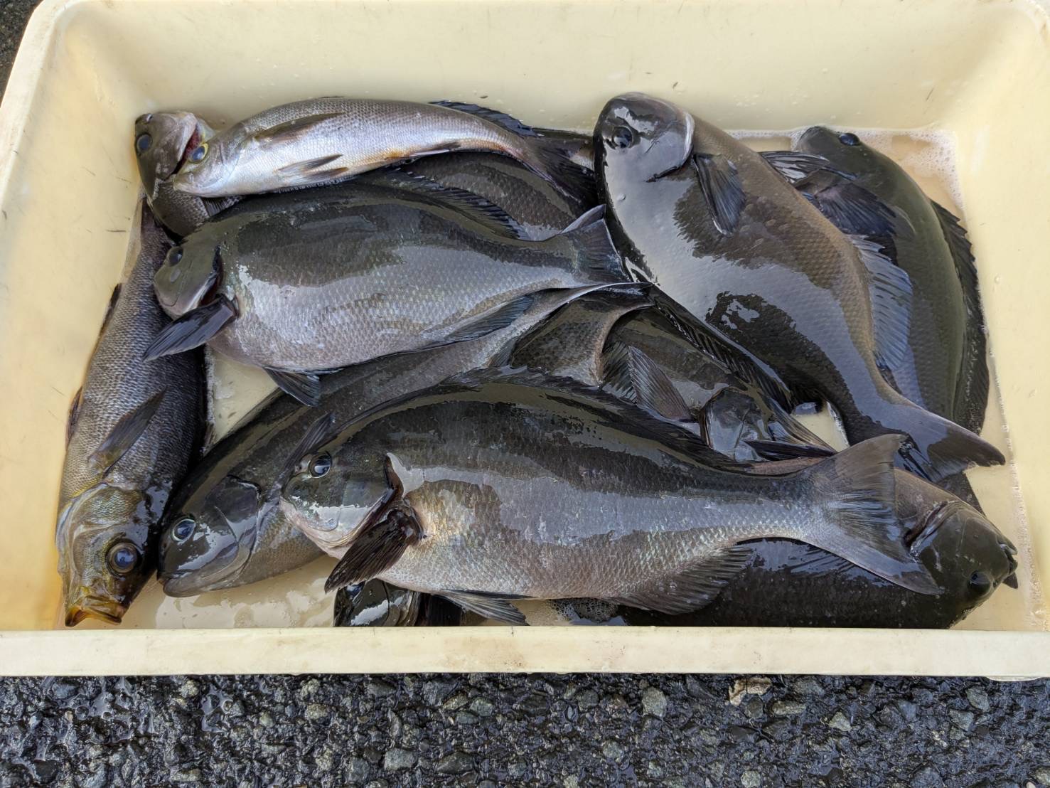 今日は朝のうちは上り潮でそれほど速くなく満潮を過ぎて段々と緩くなりました、9時頃からは緩い下り潮での感じでした🎣今日の一番の45cmオーバーは本場側でサラシを利用し張り気味に仕掛けを送ると2ヒロから3ヒロくらいの浅い棚でひったくるあたりで食わせました、仕掛けを緩ませて流した場合は食いが悪くなる感じです、また尾長メジナは40cmオーバーばかりで良型がほとんどです、残念ながら口太メジナは40cmは越えなかったのですが、平均サイズ37cm前後ですが目方がある腹ボテのメジナですので食べては美味だと思います🎣イサキは潮が良く通る場所で釣り座を構えれば一時期入れ食いになる状況でした