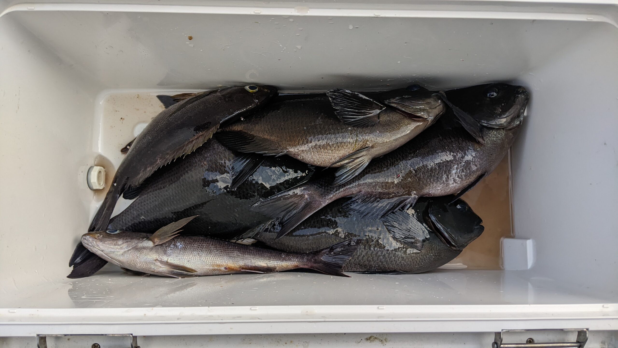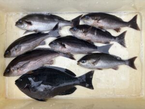 今日も昨日に引き続き朝方から北東風が強く吹いておりましたが波はそこまでなかったのと風裏でもあった為渡礁はできました、水温は相変わらず安定していて朝方は上り潮がトロトロ入っている感じで12時を過ぎた頃から下り潮が緩く入り始めた状況でした、本場側では少し深い棚でイサキのお土産釣りが出来るのですが少し沖側で釣りをされている方たちはイサキの反応は今一つでポツポツ程度でした🎣ですがメジナは場所にもよりますが昨日よりサラシがあまり無かったのですがサラシを上手く利用して2ヒロから3ヒロで魚が口を使います、今日は尾長メジナより口太メジナの方が反応は多く数は出ましたが惜しくも40cmオーバーは出ませんでしたが皆さん釣りを楽しめられたようで良かったです🎣