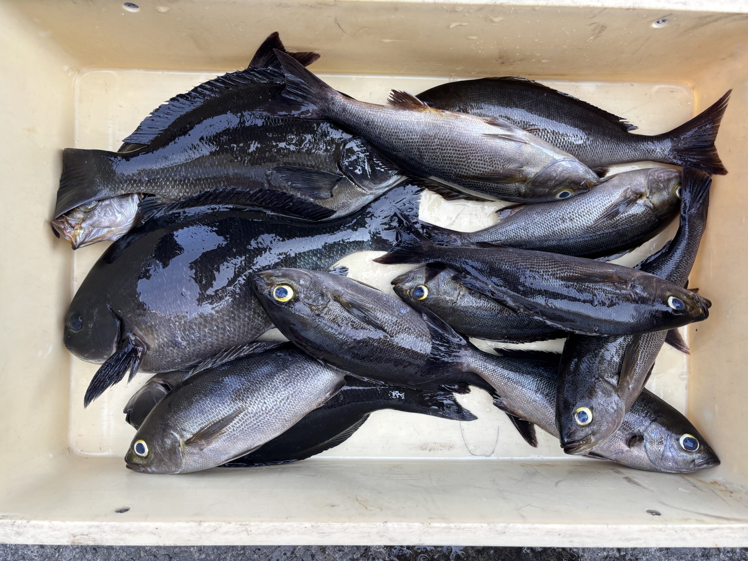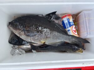 今日は朝の内は風も凪ていて波もなかったので各場所へと渡礁はできました、朝方は上り潮が緩く利いている感じで場所によっては一時イサキの入れ食い状態があるなどクーラーに入りきらない程でリリースされている方も居ました🎣イサキが釣れなくなると今度はメジナが口を使い始めるのですが数はあまり出なかった様です、ですが本場側やカリト鼻では潮の来る方向が悪いのか11時頃から下り潮に変わりそこそこ速かったのですが、魚が中々口を使わないのでイサキはポツポツ程度でした、餌取りも少ない状況でエサが余るくらいで活性は今一つでしたが、それでもサラシはあったので狙いを定め辛抱強く我慢して40cmオーバーの尾長メジナを一発のチャンスで物にした方や口太メジナの40cmが出るなど、皆さん釣りを楽しめられたようで笑顔が絶えず良かったと思います🎣この時メジナの食う棚は2ヒロから3ヒロでした