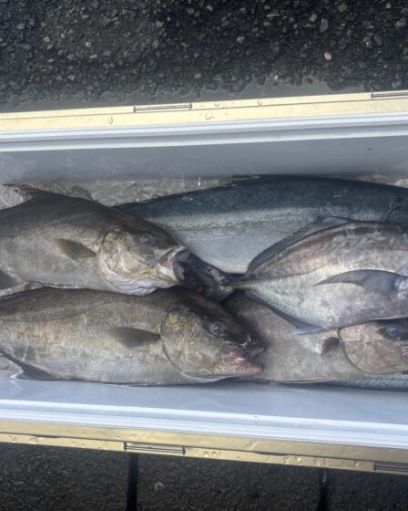 8月1日(木) 晴れ 中潮 北東の風 6~9m 下りの潮 強 水温 28~29℃ 釣果 カンパチ、ヒラマサ、シ …